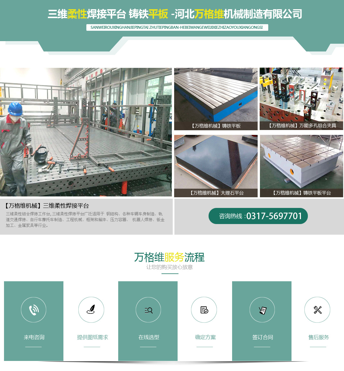 河北萬格維機械制造有限公司位于著有中國鑄造名城、中國鴨梨之鄉的泊頭市,東臨渤海北依京津,處于鐵路、公路、海運的樞紐地帶,交通方便,地理位置_。河北萬格維機械制造有限公司主要產品有: 三維柔性焊接平臺、鑄鐵平板、多孔組合夾具、檢驗平臺、基礎平臺、T型槽平板、研磨平臺、劃線平板、鉗工工作臺、大理石平臺、方箱方筒及塞規系列。